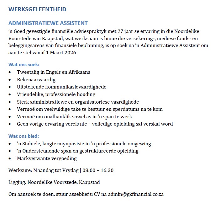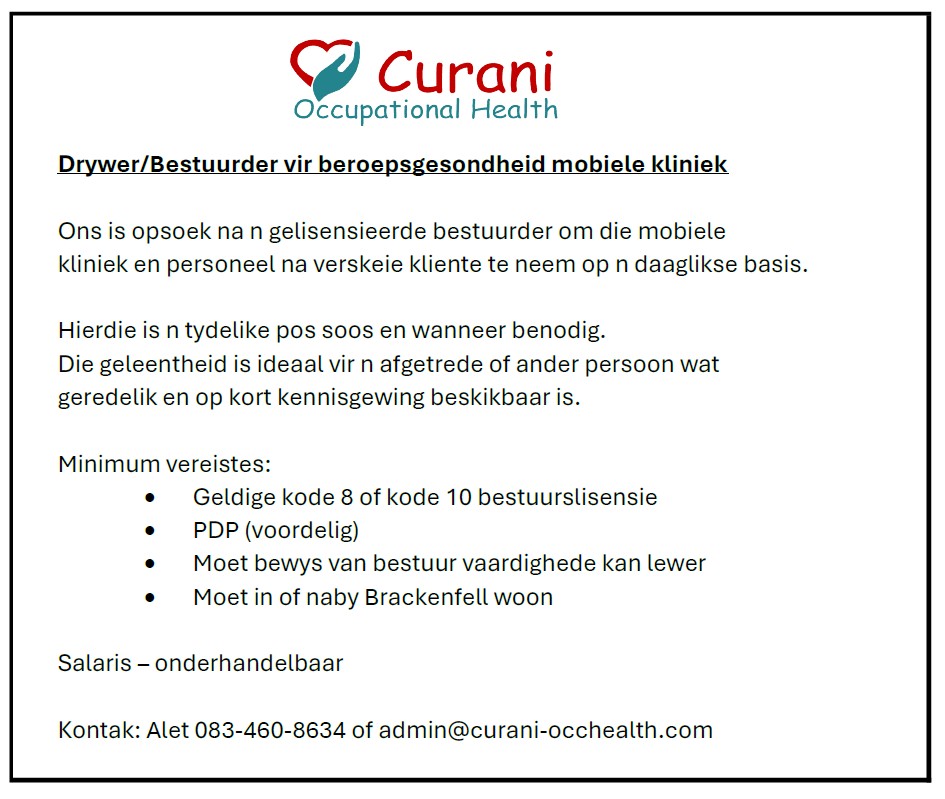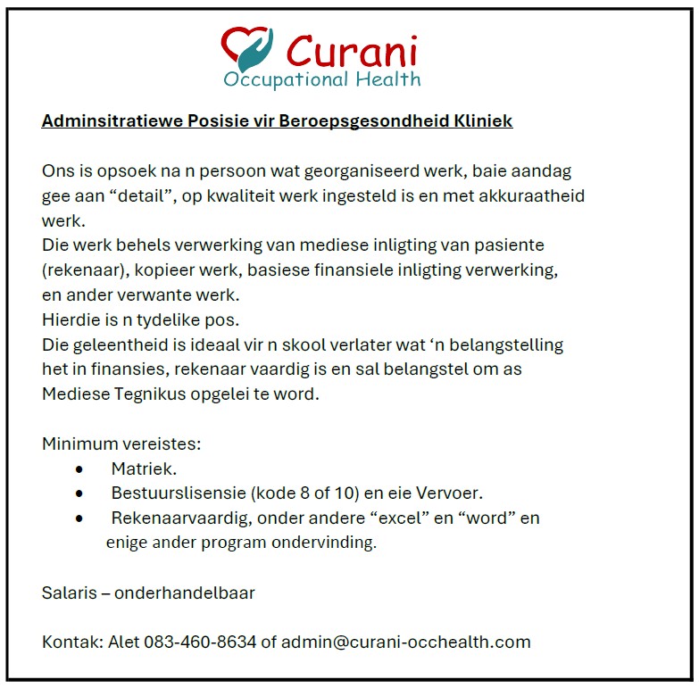 - Ester soek 3x per week permanente werk: Dinsdae, Woensdae en Vrydae. Verwysing 083 441 3998. Kontak Ester op 063 388 7983. (31/03)